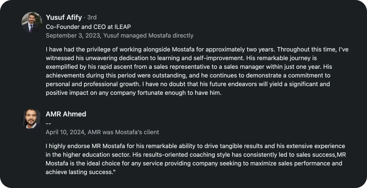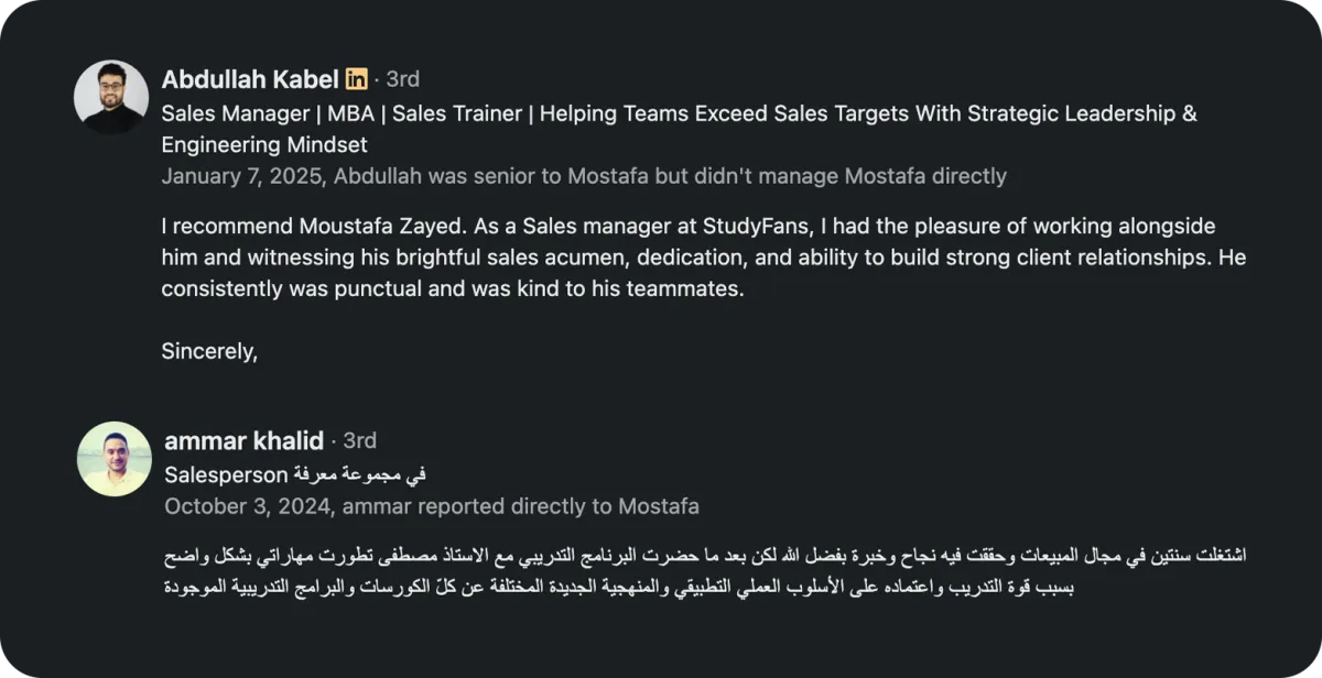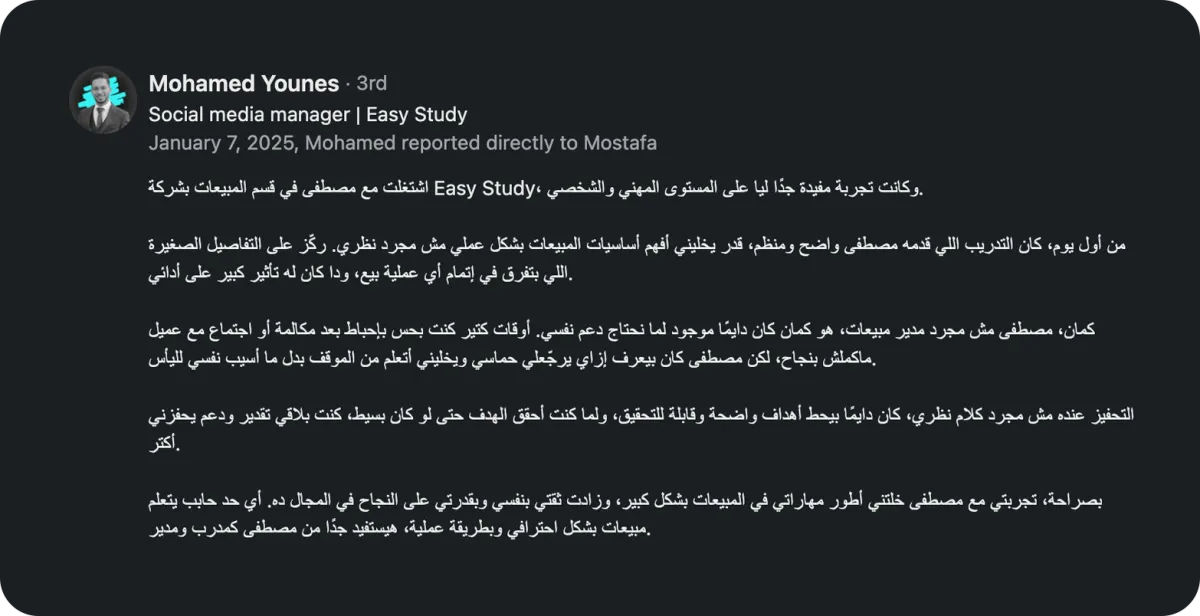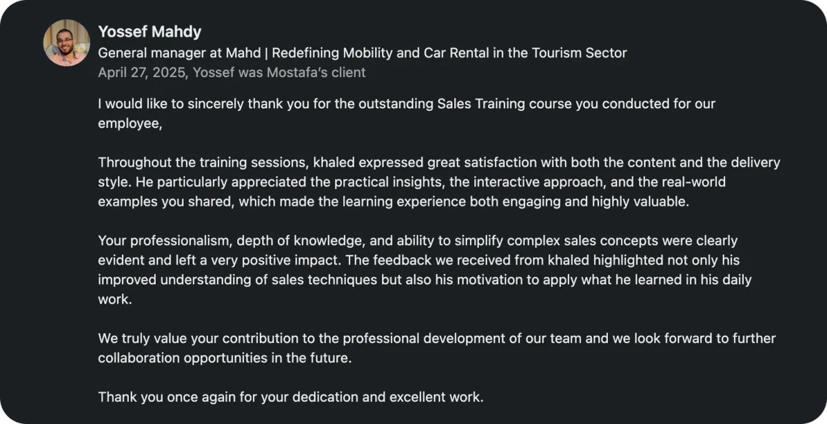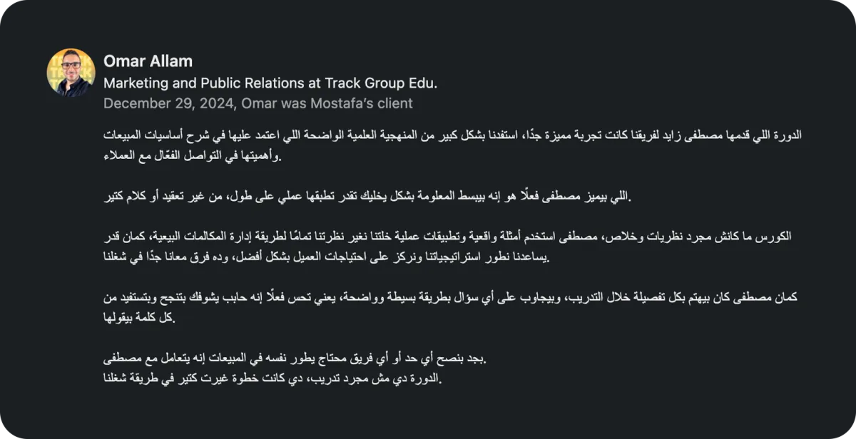 اليوم، يُعرف اسمي كأبرز صانع محتوى عربي في مجال المبيعات داخل تركيا، وأقدم تدريبات واستشارات تساعد رواد الأعمال و أصحاب البزنس على تحقيق نتائج إستثنائية.